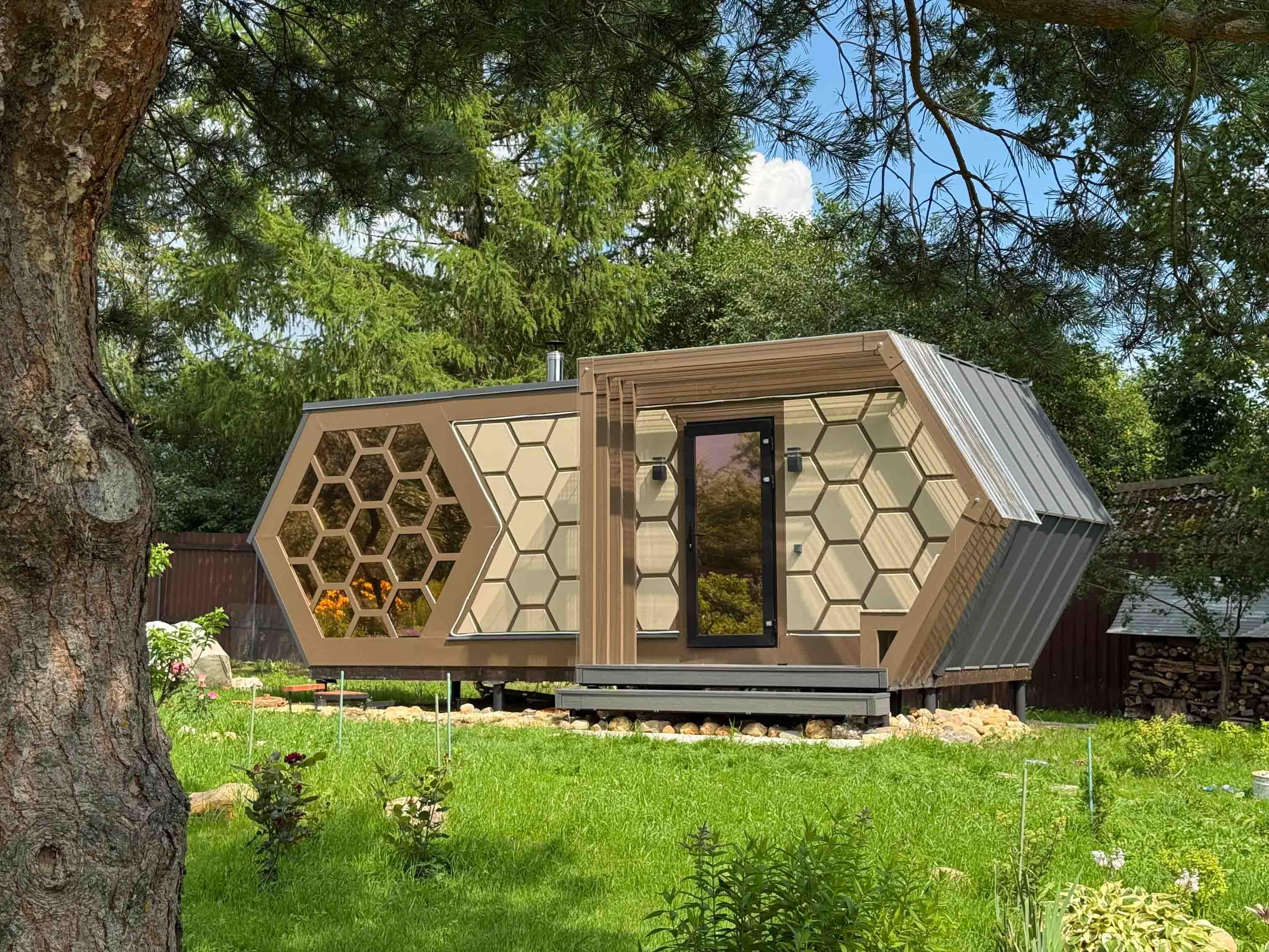 Входит внешняя отделка с декоративными сотами и покраской фасада в любой цвет, а так же внутренняя отделка, с оборудованием (розетки, выключатели, светильники, водонагреватель, теплые полы, сантехнические приборы), инженерией и мебелью в ванных комнатах.