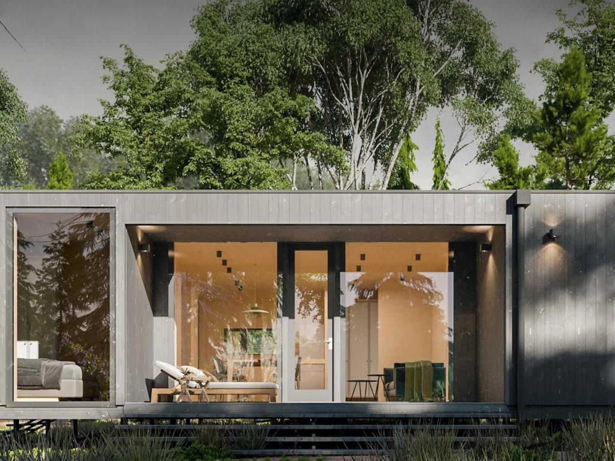 Просторный дом из 4 модулей 65 кв м Включает в себя спальню, кабинет/детскую, санузел и просторную гостиную с кухней. Из дома имеется три выхода на террасы.