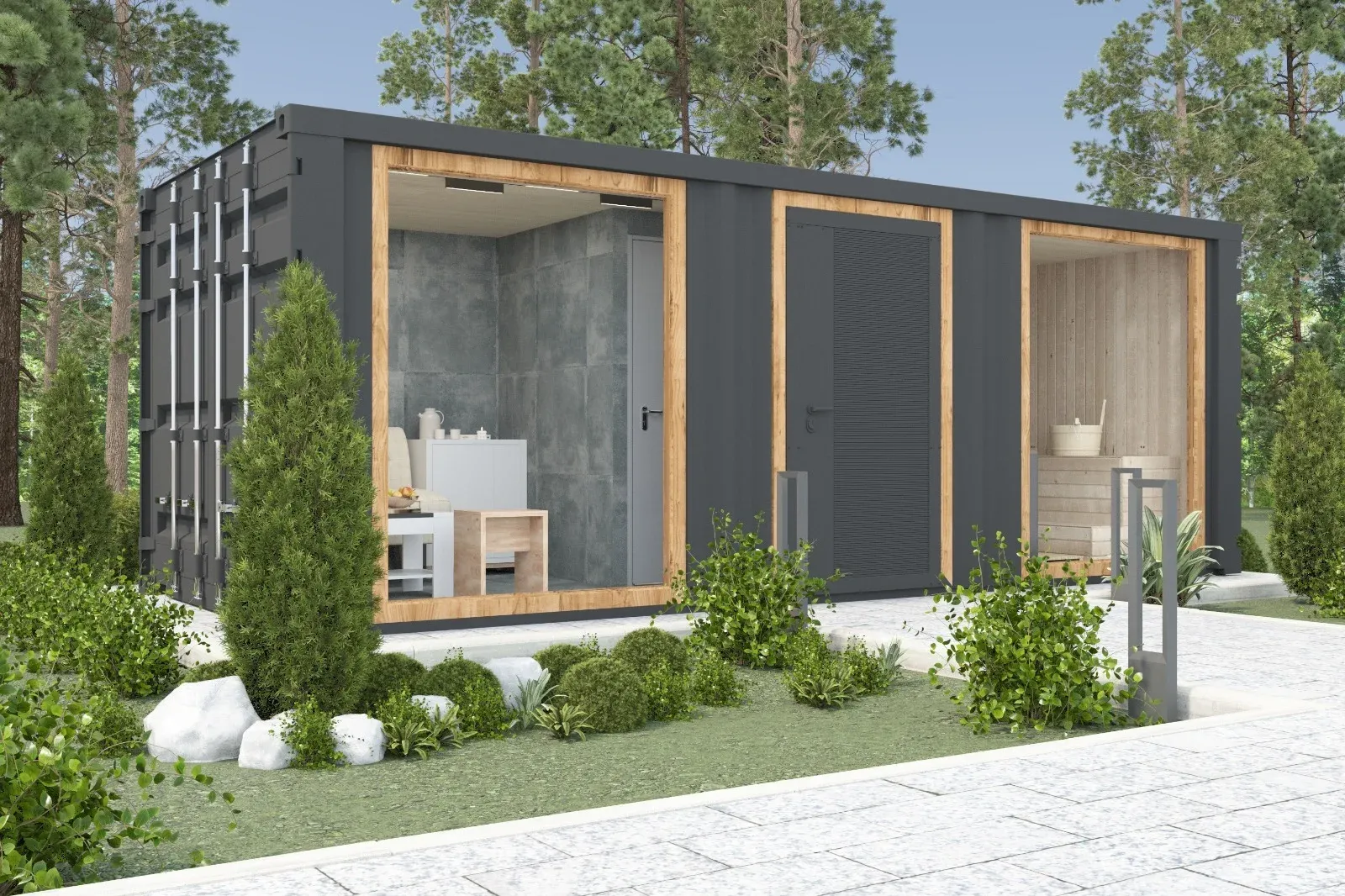 «Бу́хта-Пар» — это полноценная модульная баня с продуманной планировкой и стильным интерьером. Подойдёт для личного участка, базы отдыха или глэмпинга.