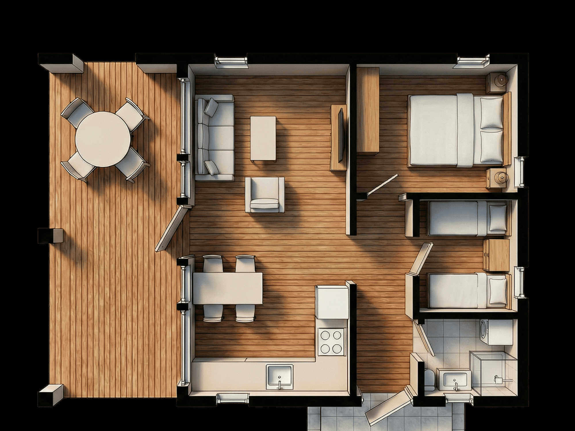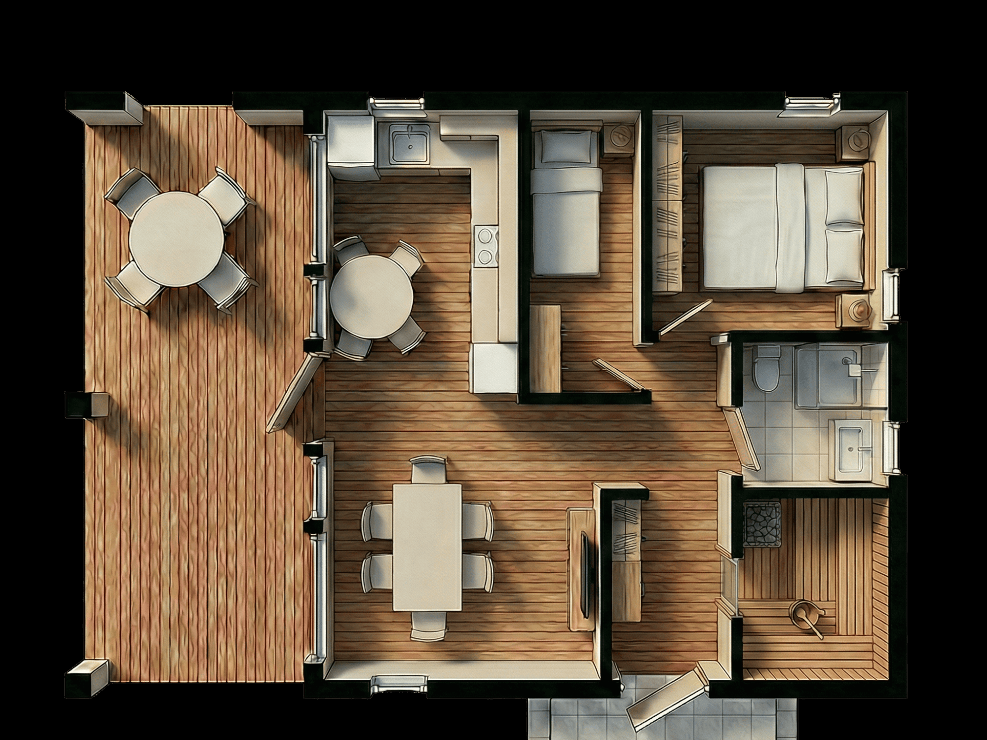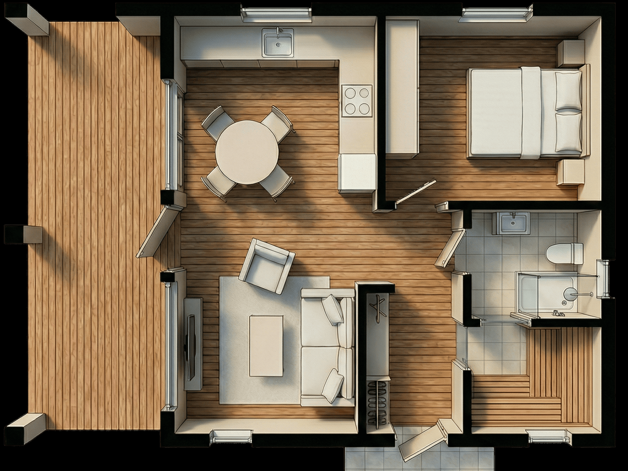 Функциональная планировка рассчитана на удобное размещение гостей: просторная гостиная, отдельная спальня, санузел и возможность организации террасы. Панорамные окна наполняют интерьер естественным светом и создают ощущение открытого пространства без потери уюта.