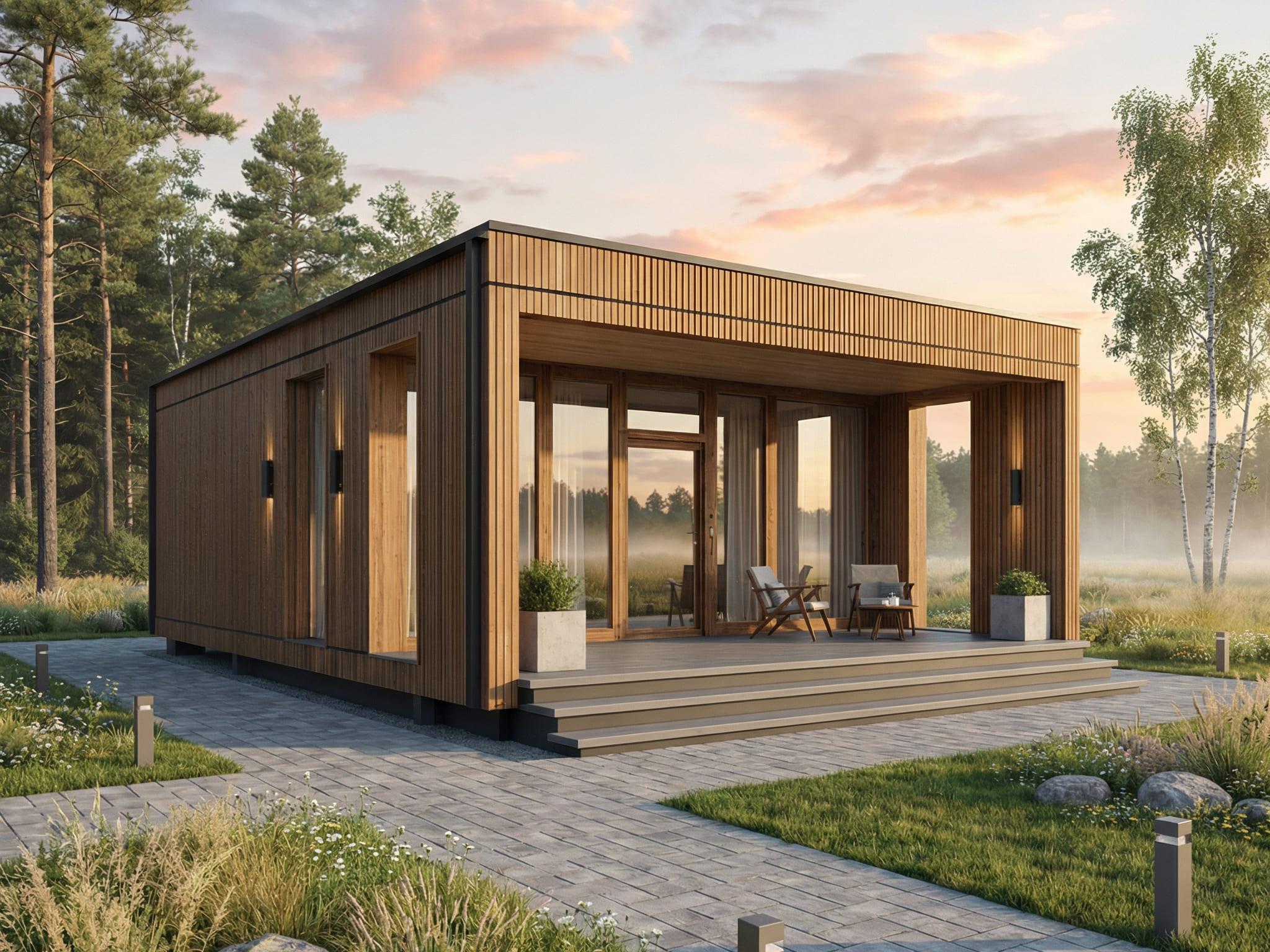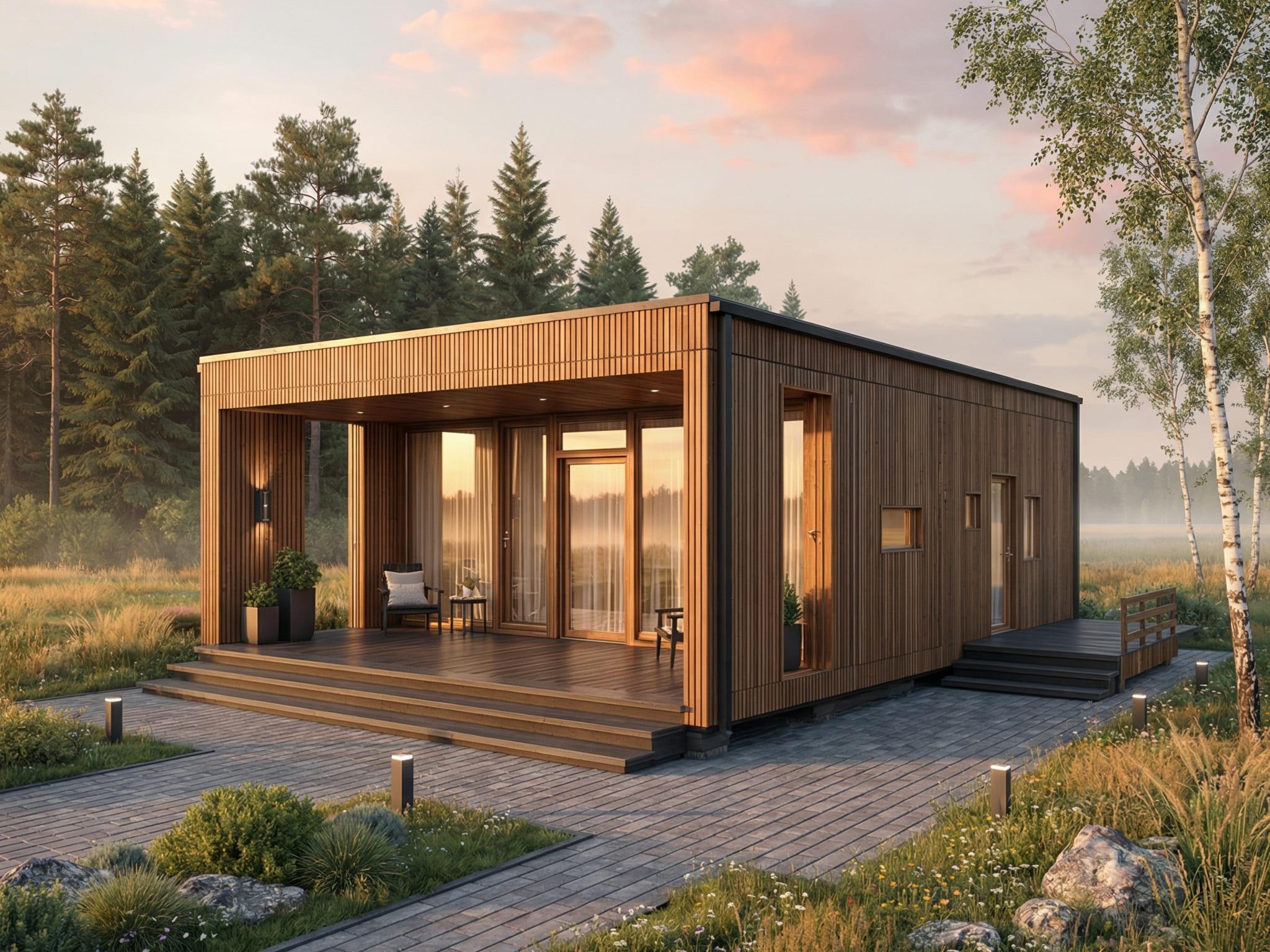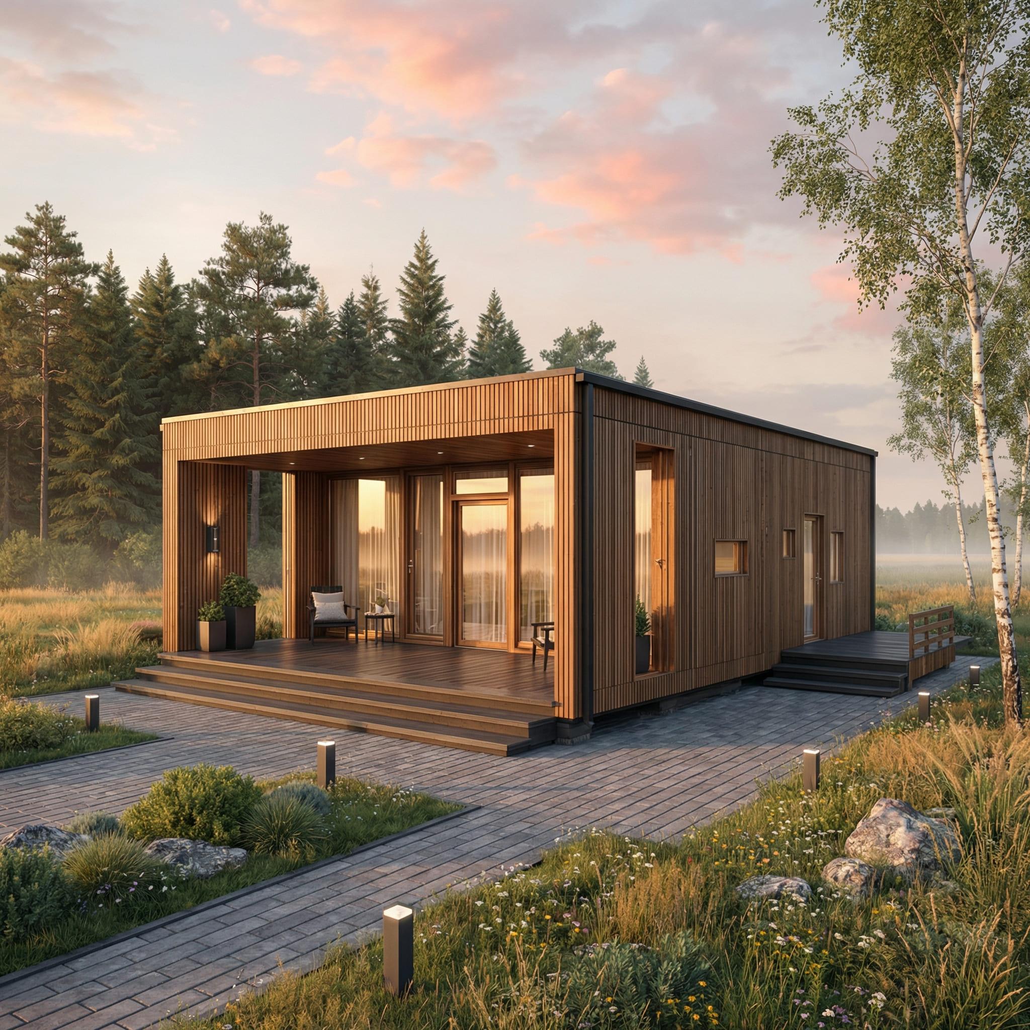 Современный модульный дом с выразительной горизонтальной архитектурой, разработанный для комфортного отдыха в природной среде. Прямые линии, тёплая отделка из натурального дерева и панорамное остекление формируют спокойный, уравновешенный образ, который органично вписывается в ландшафт.
