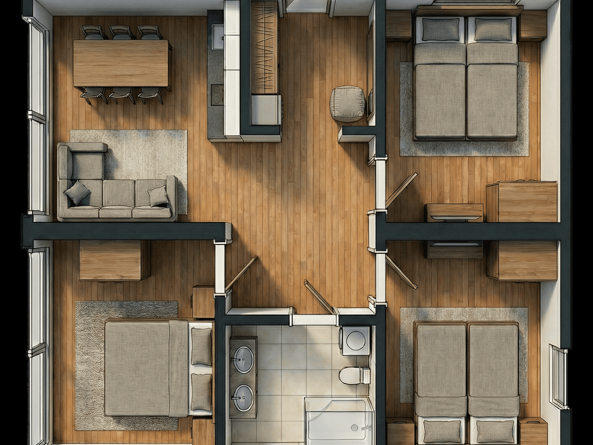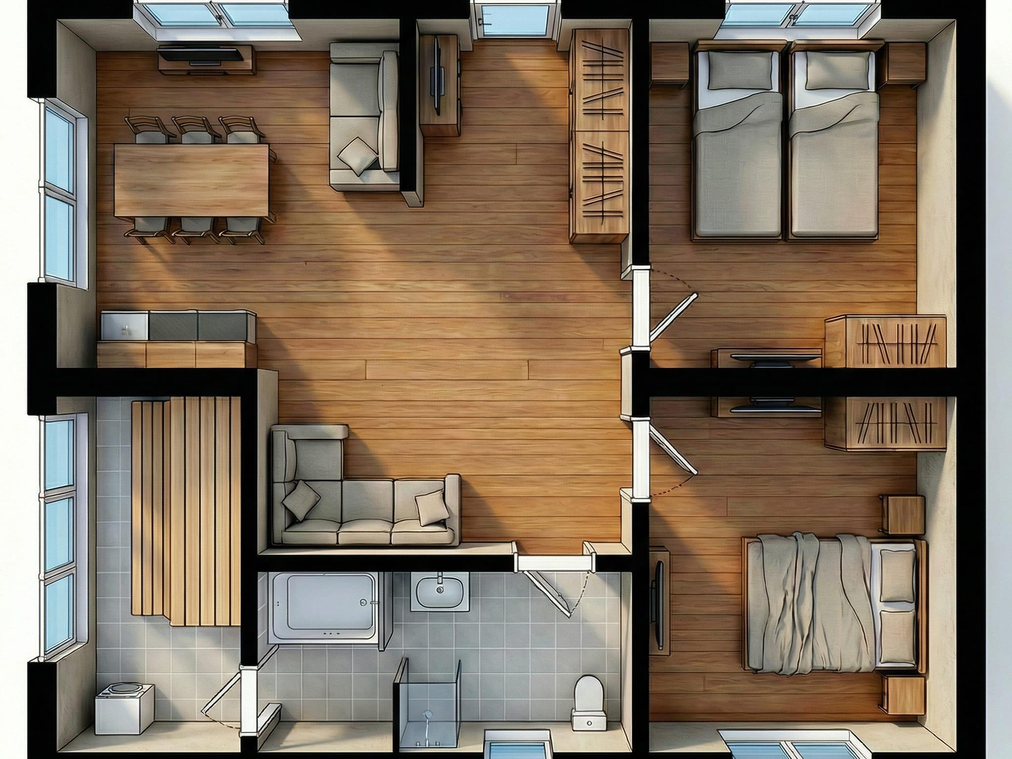Функциональная планировка рассчитана на удобное размещение гостей: отдельная спальня, кухня-гостиная, санузел и возможность выхода на террасу. Панорамные окна наполняют интерьер естественным светом и усиливают ощущение уюта без перегруженности пространства.
