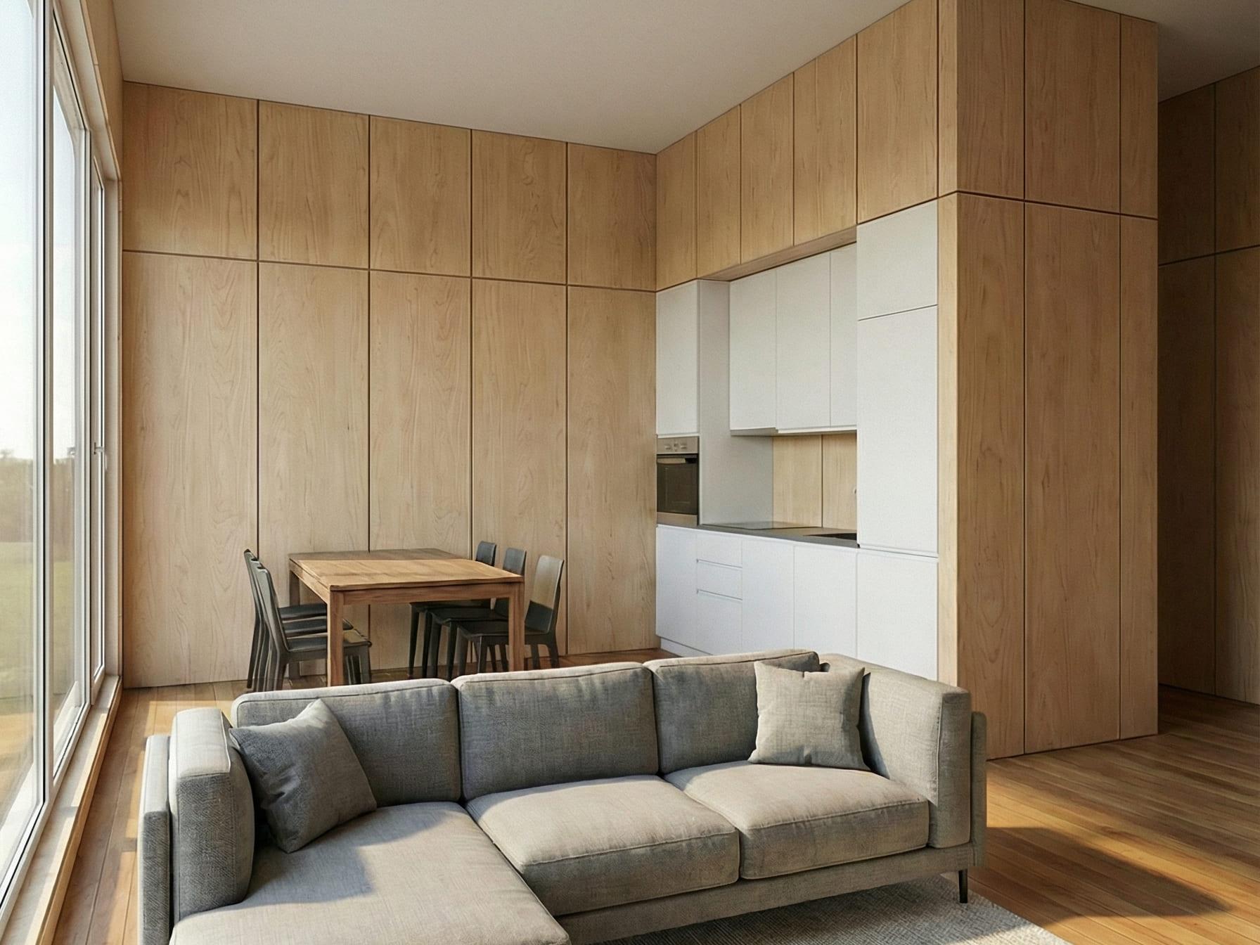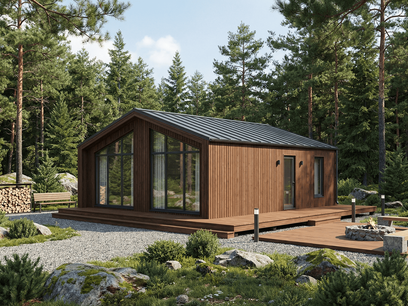 Лаконичный модульный дом с северным характером, созданный для комфортного отдыха в природной среде. Простая геометрия, натуральная древесина в отделке и панорамное остекление формируют тёплый, сдержанный образ, который гармонично вписывается в лесные и прибрежные ландшафты.