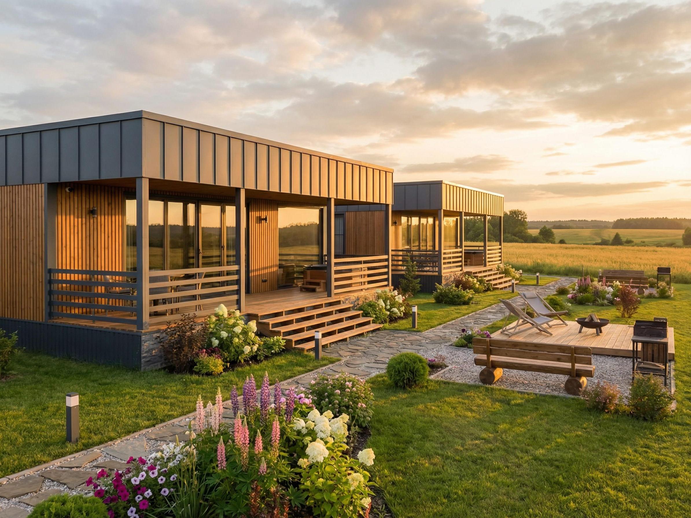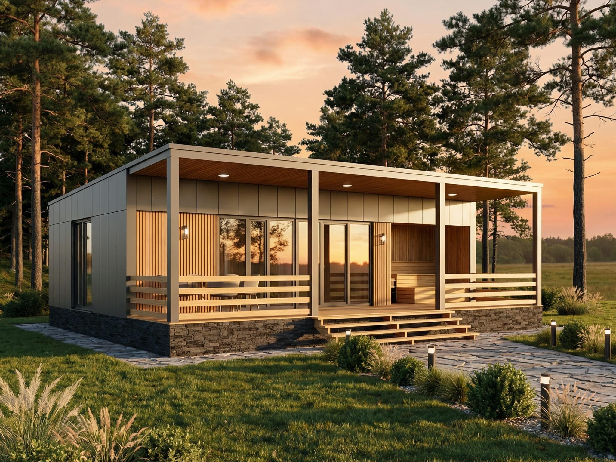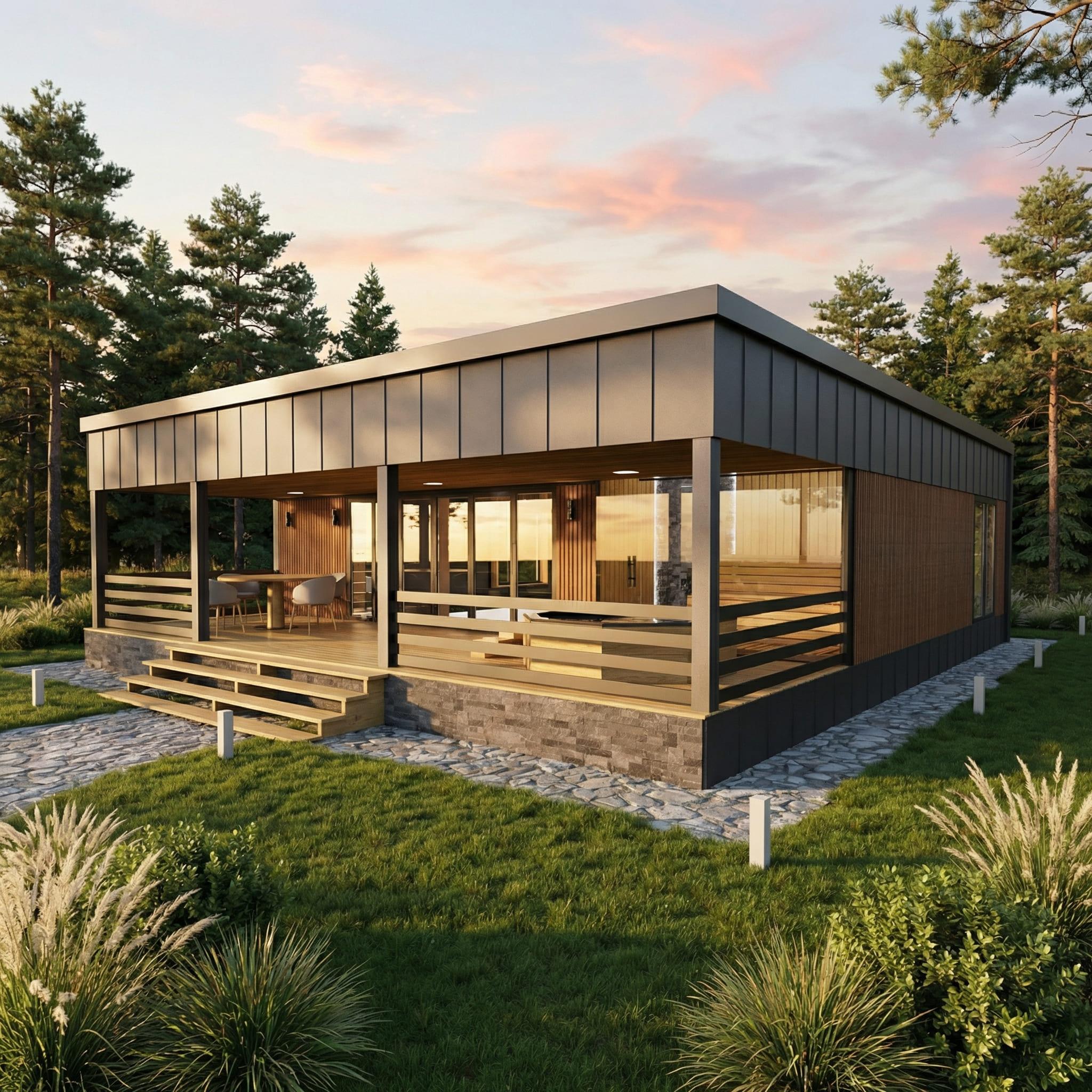 Просторный модульный дом с современной архитектурой, созданный для комфортного отдыха и длительного проживания на природе. Чёткая геометрия, панорамное остекление и натуральные материалы формируют светлый, открытый образ, который гармонично вписывается в природный ландшафт.